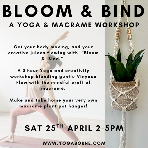 “Bloom and Bind” is a 3 hour Yoga & Creativity Workshop blending a gentle Vinyasa Flow with the mindful craft of macramé.