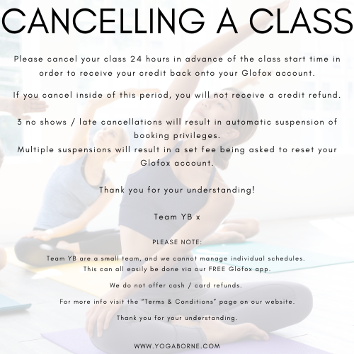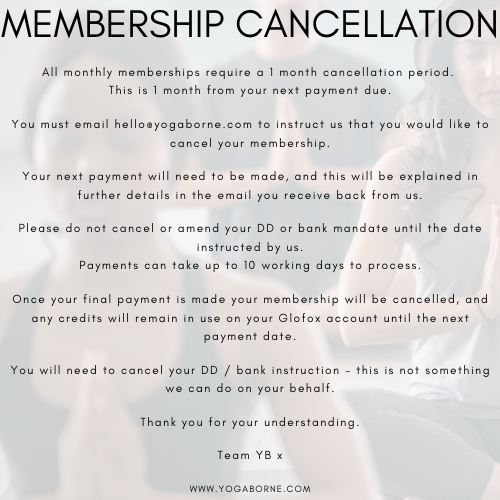 If you do not cancel your direct debit mandate and further payments are taken from your bank account, Yoga Borne takes no responsibility for this and will not offer any refund.